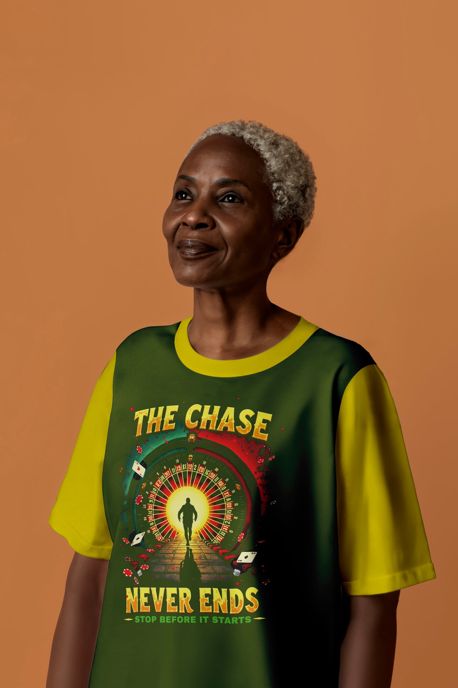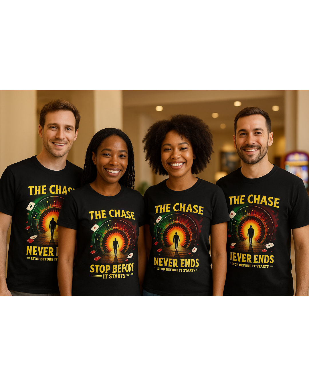 This design shines a light on the endless cycle that often begins long before addiction takes hold. “The Chase Never Ends” represents the powerful pull of gambling’s highs and lows — the thrill that keeps people chasing what’s already gone.