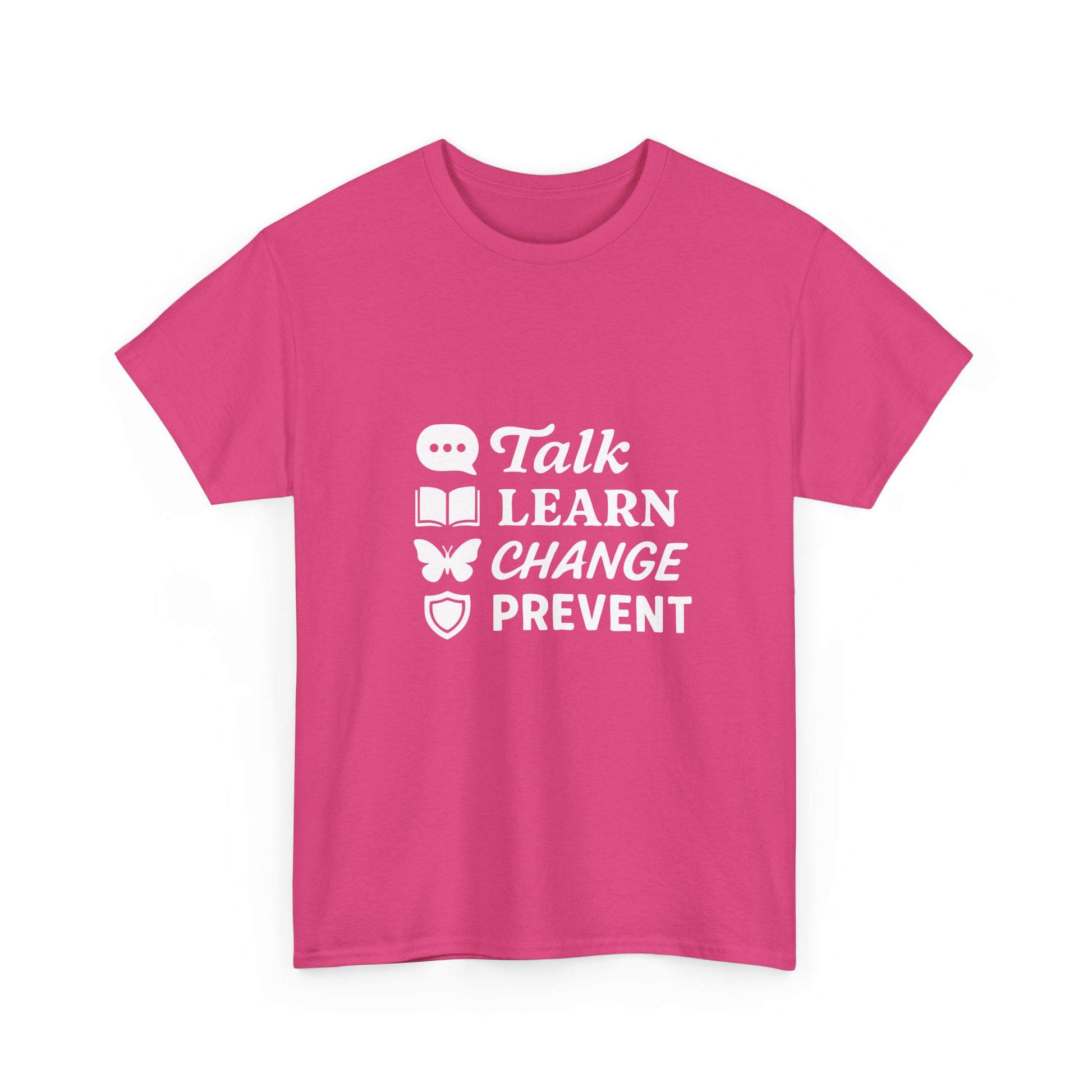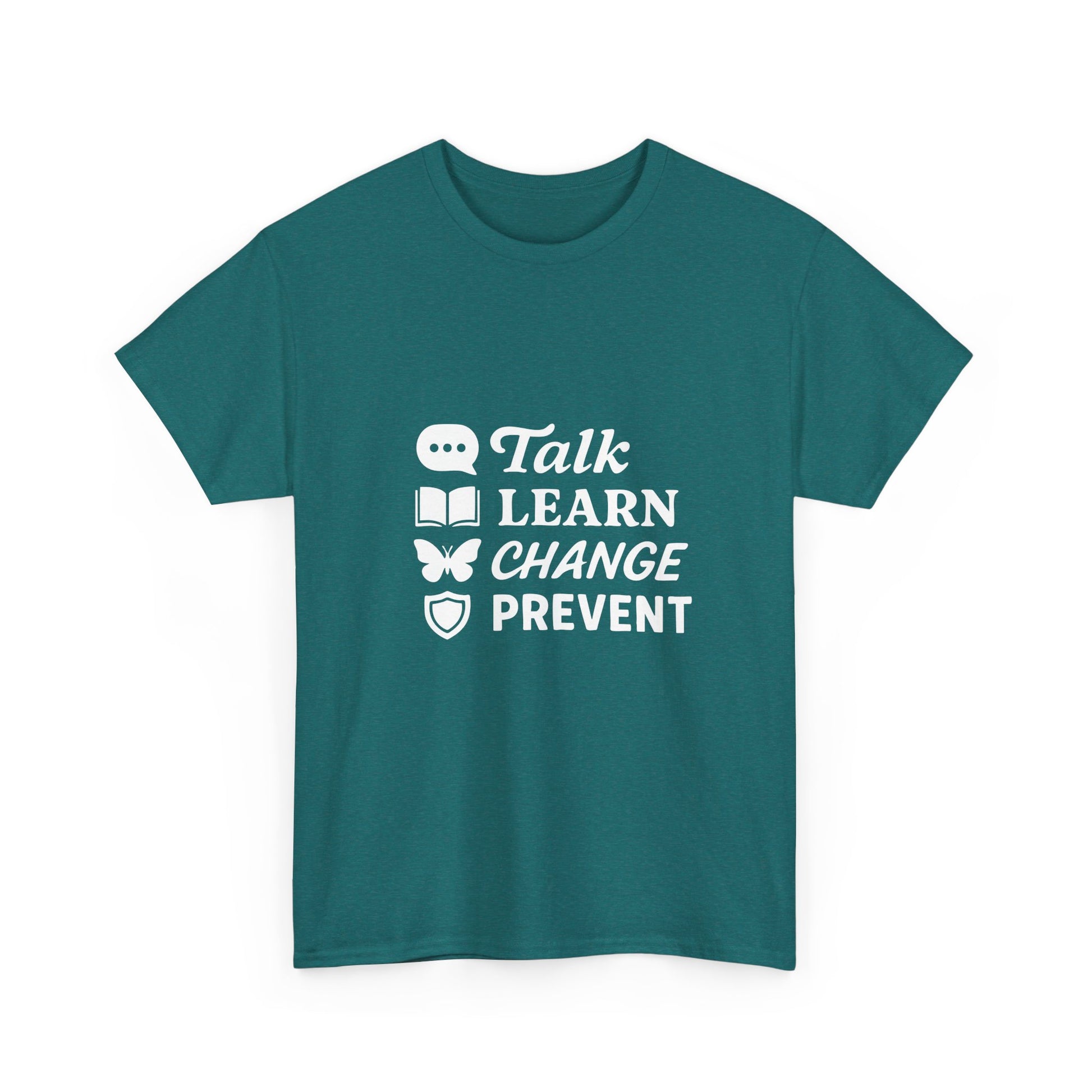 Gambling Addiction Recovery Awareness T-Shirt – Talk Learn Change Prevent Tee – bold white