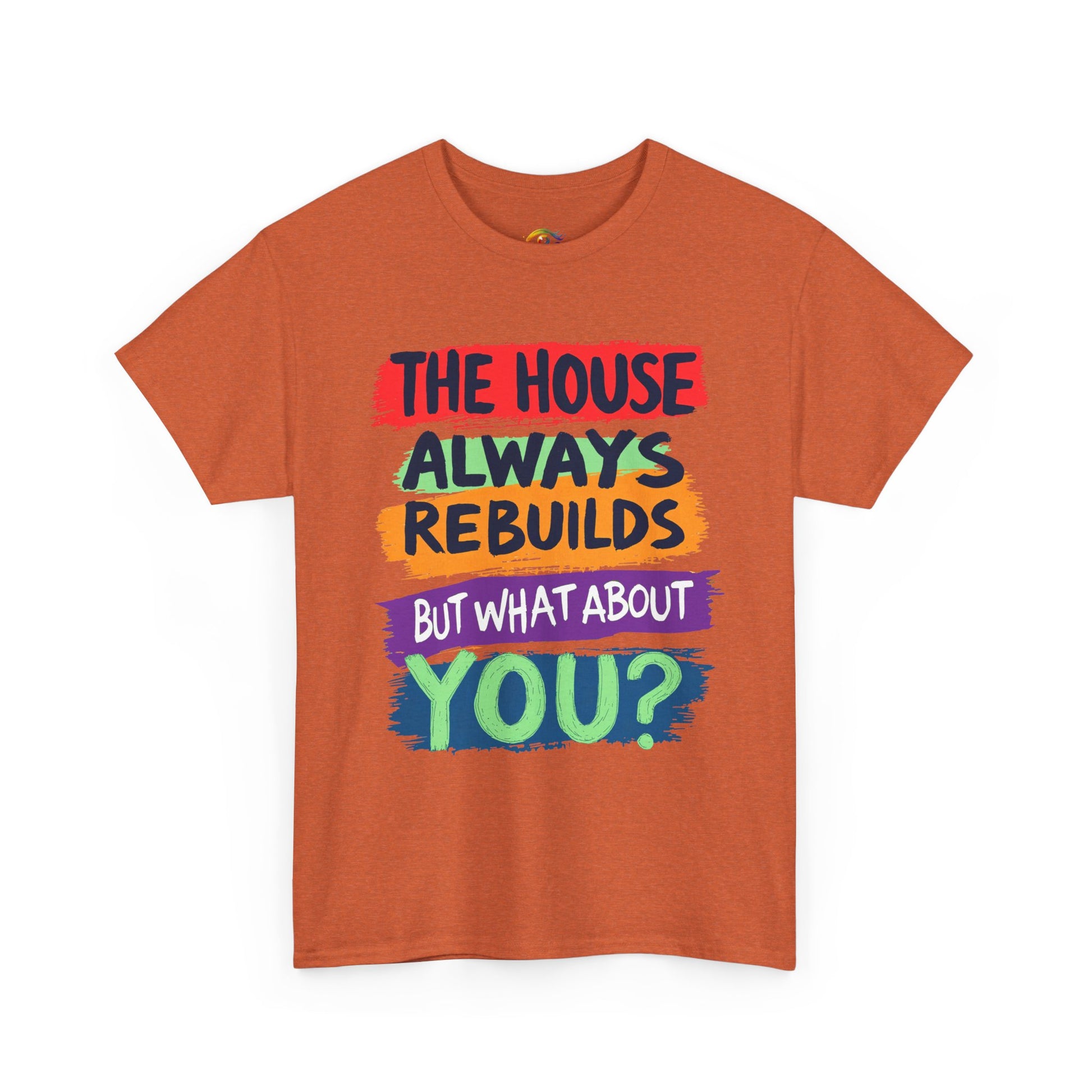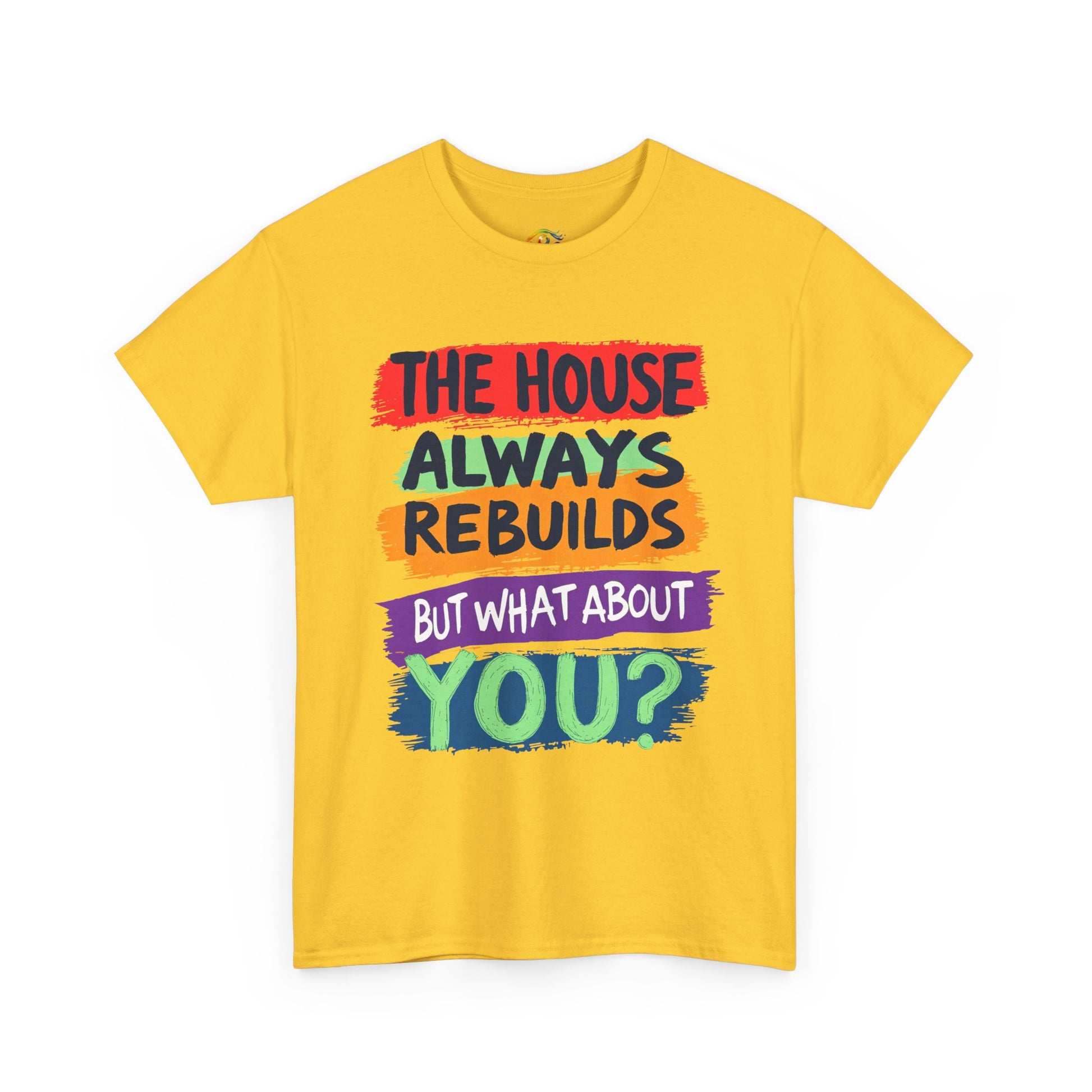 Stay comfortable and stylish with this classic T-Shirt featuring the inspiring design 'The House Always Rebuilds'. Perfect for adults looking for a versatile and durable tee for year-round wear. The classic fit and crew neckline make it suitable for any occasion, from casual to semi-formal. Ideal for those seeking a cozy and timeless look.