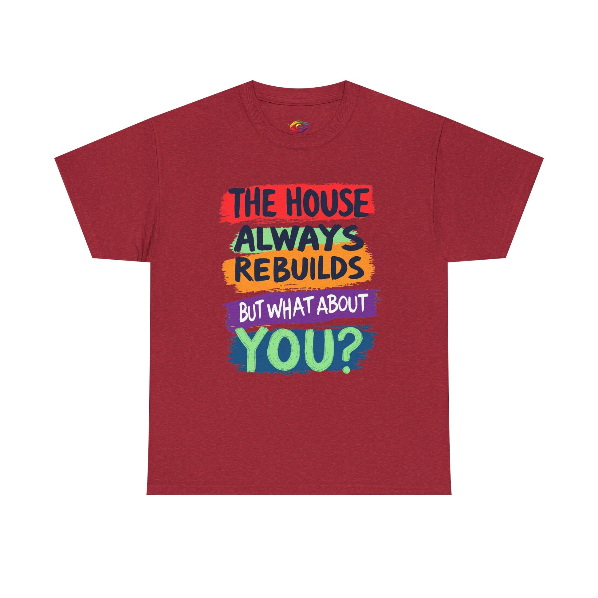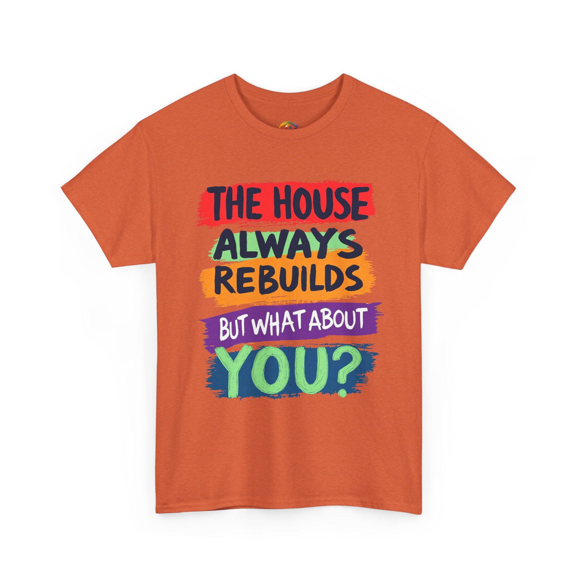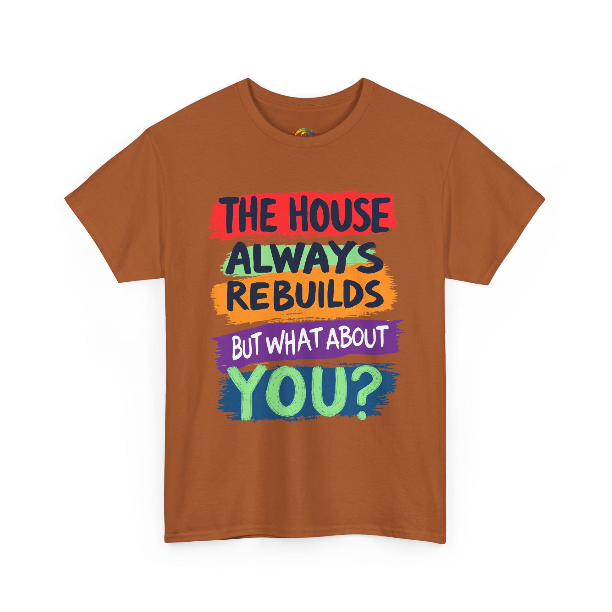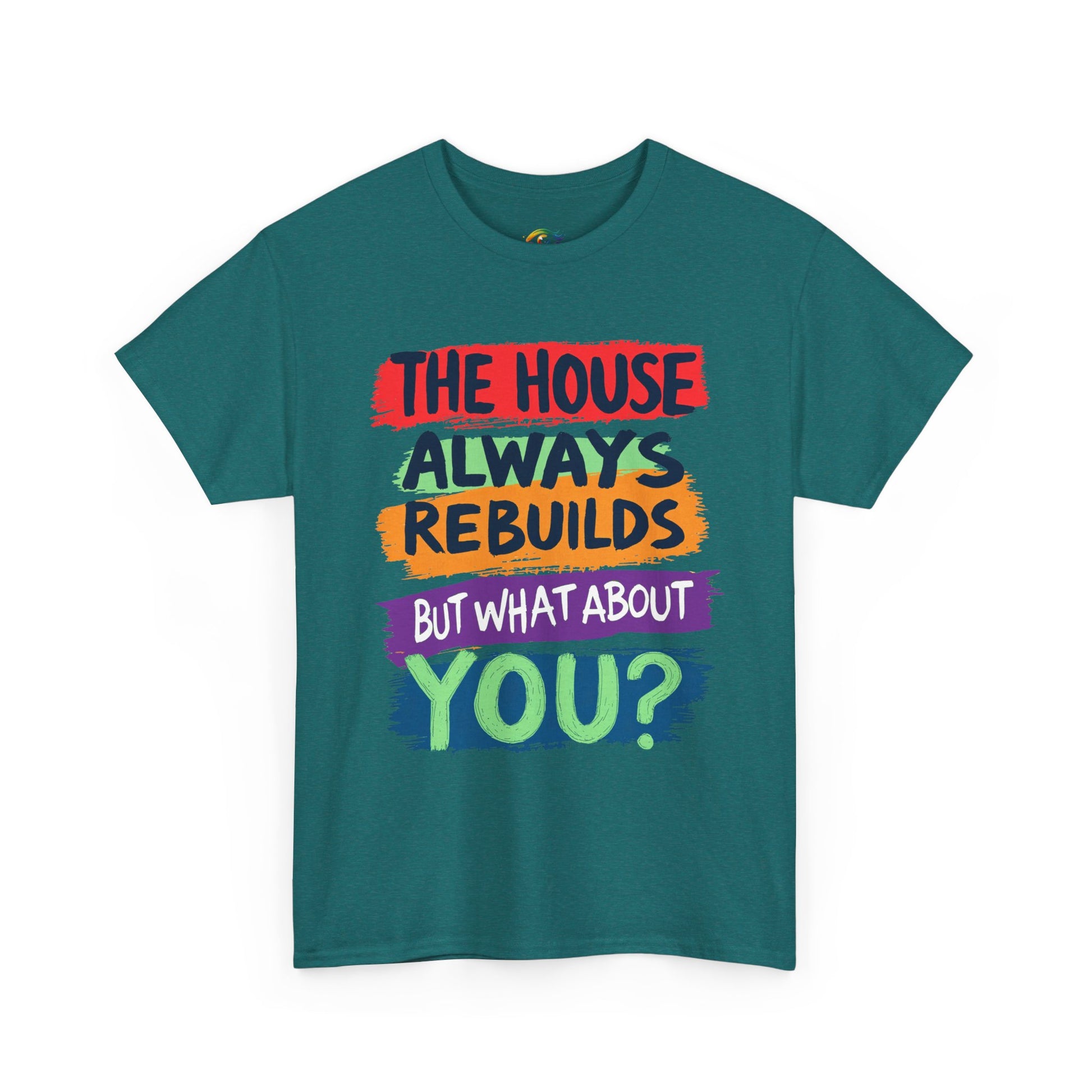 Stay comfortable and stylish with this classic T-Shirt featuring the inspiring design 'The House Always Rebuilds'. Perfect for adults looking for a versatile and durable tee for year-round wear. The classic fit and crew neckline make it suitable for any occasion, from casual to semi-formal. Ideal for those seeking a cozy and timeless look.